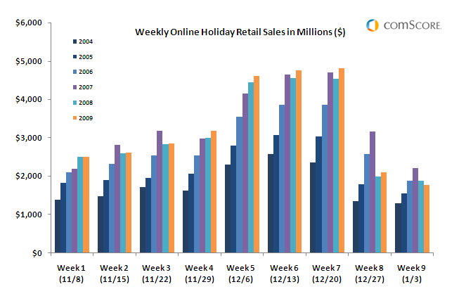 - PIN Payments News Blog -  comScore (NASDAQ : SCOR), a leader in measuring the digital world, today reported holiday season retail e-commerce spending for the entirety of the November – December 2009 holiday season. For the full holiday online shopping season, $29.1 billion was spent online, marking a 4-percent increase versus the same period last year. The season featured distinct periods of strong spending growth surrounding the Thanksgiving-Black Friday timeframe and the final shopping week leading up to Christmas.
